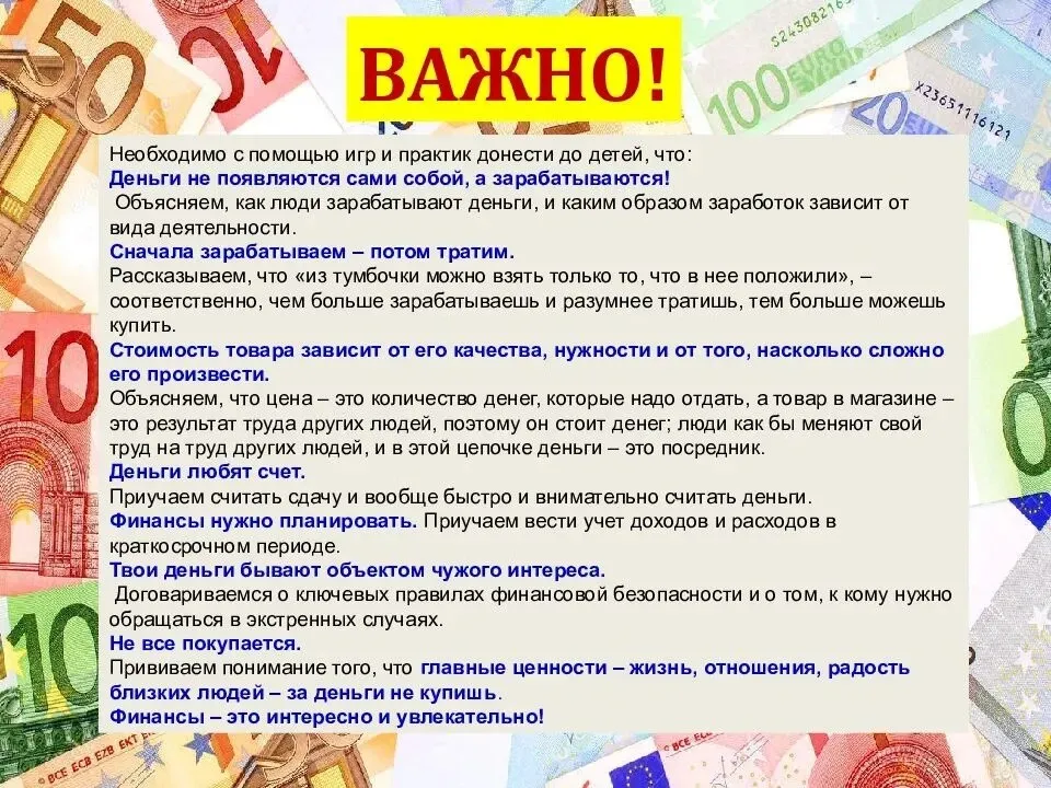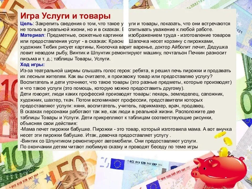 -научить детей понимать назначение денег; их необходимость в жизни человека;