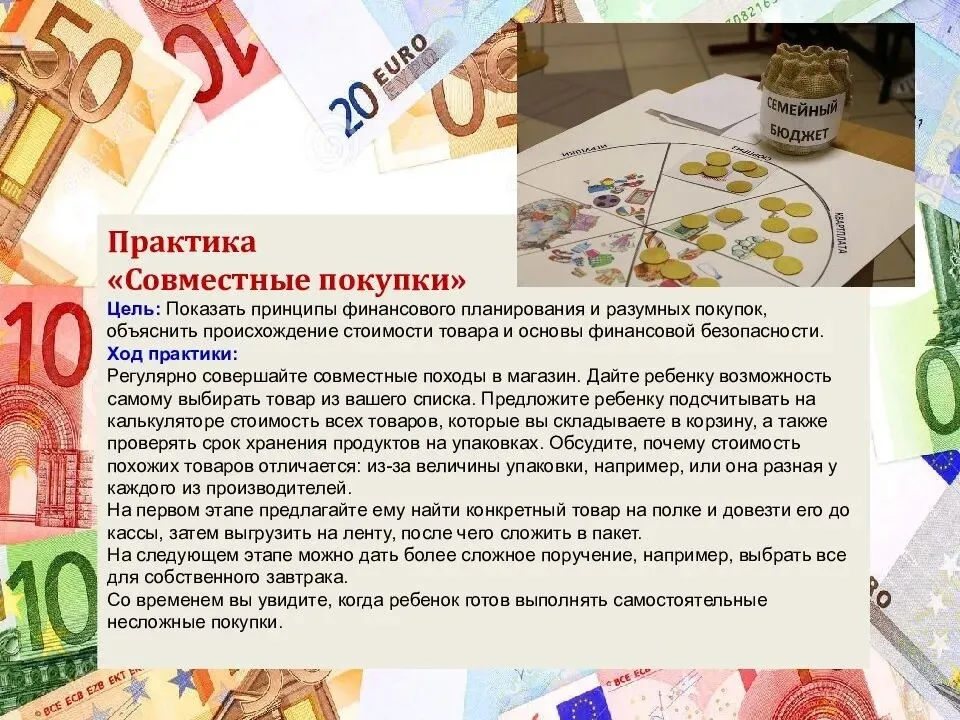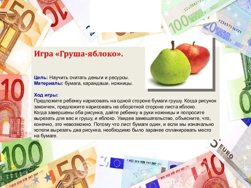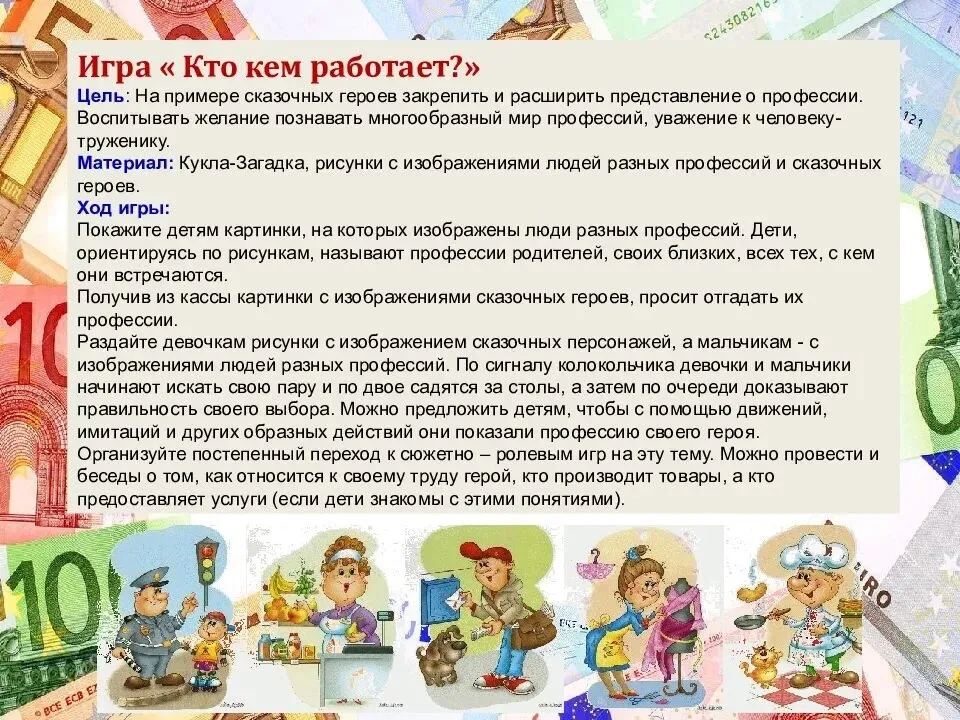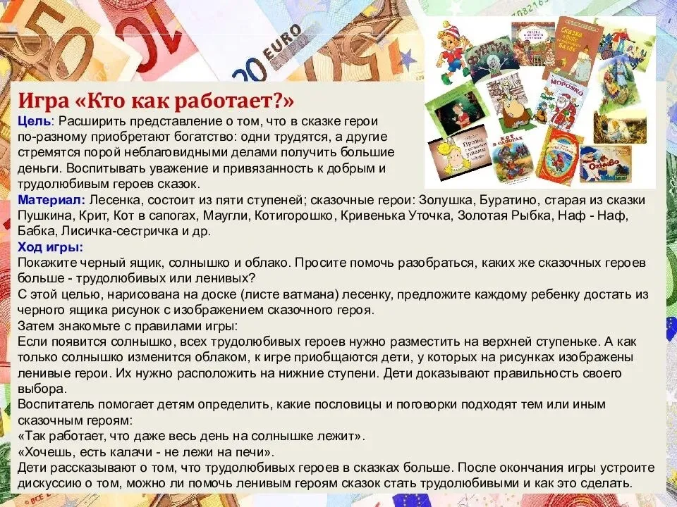 Воспитывать умение правильного обращения с деньгами, монетами, картами.