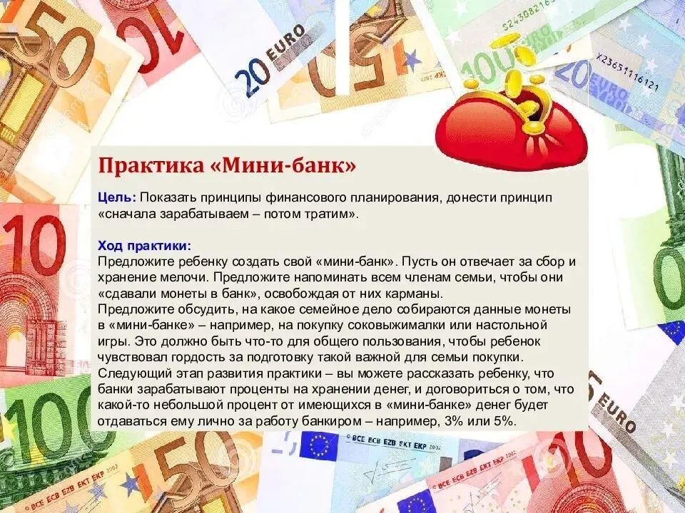 Материалы: мяч, копилка с набором разных монет и банкнот, бумага и цветные карандаши.