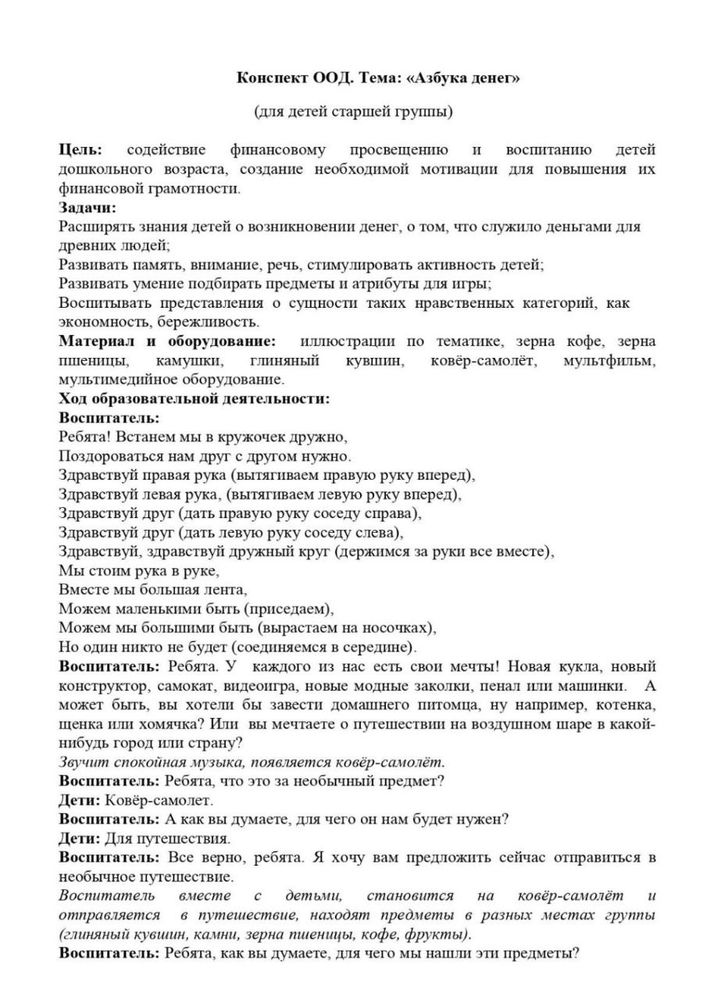 Конспект ООД. Тема: «Азбука денег»